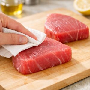 Take your ahi tuna steaks out of the refrigerator and place them on a clean cutting board or plate. Use a paper towel to gently pat them completely dry on both sides. I know this seems like an extra step, but moisture is the enemy of a good sear—it creates steam instead of that golden, caramelized crust we’re after. Don’t be aggressive; just enough pressure to remove the surface moisture. If your steaks are thicker or thinner than 1 inch, keep that in mind for your cooking time adjustment later.