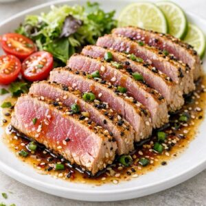 Arrange your sliced tuna on a serving plate or individual plates. Drizzle with that reserved marinade you set aside earlier—it adds moisture and extra flavor without overwhelming the dish. Scatter your sliced green onions over the top, sprinkle with toasted sesame seeds, and serve lime wedges on the side.